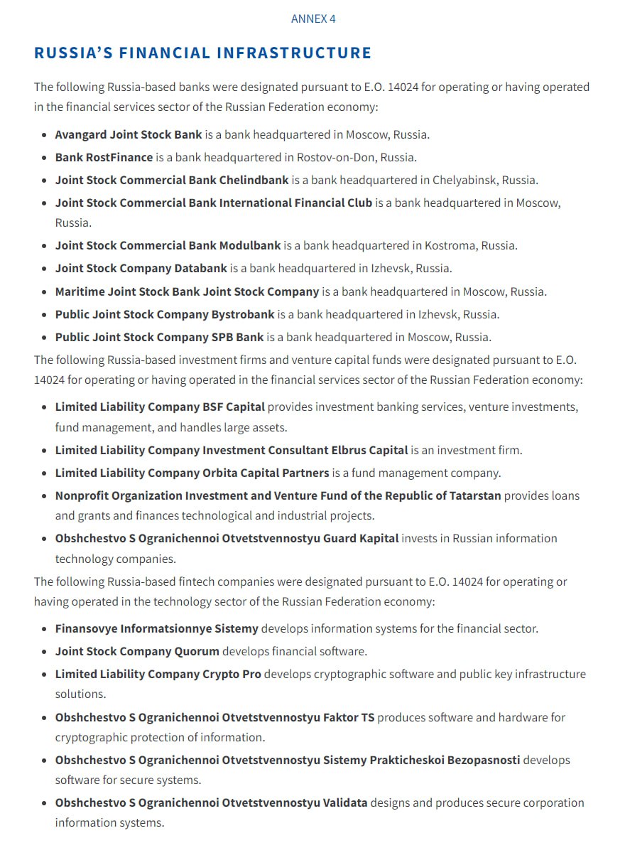 Под новые санкции США, которых больше 500, попали Национальная система платежных карт (НСПК) — оператор платежной системы «Мир», а также банк «Авангард», «Модульбанк», «СПБ Банк», «Ростфинансбанк», «Челиндбанк», «Модульбанк», «Датабанк», «Быстробанк» и другие.