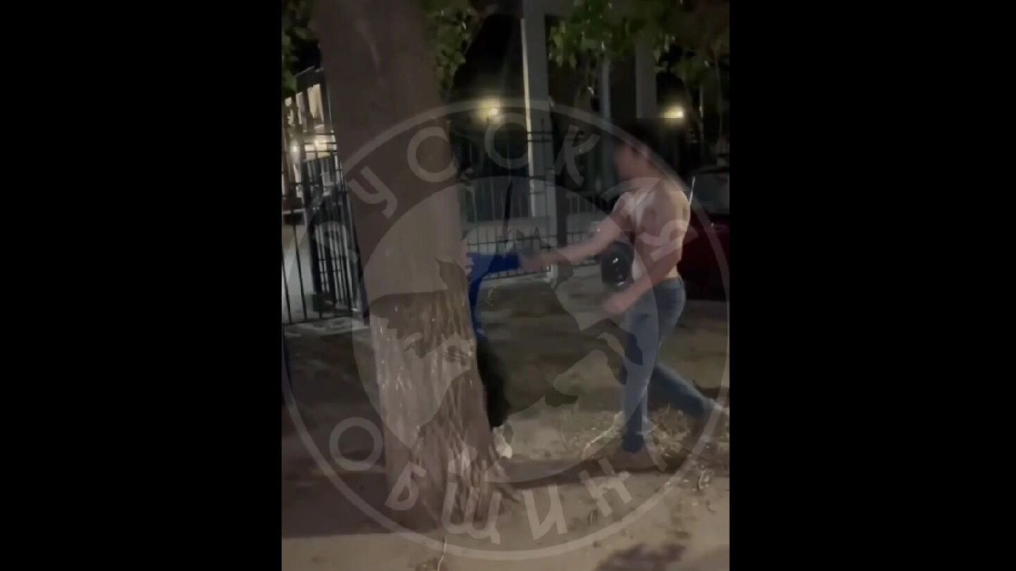 Пострадавшая стоит молча и не сопротивляется. Камера фиксирует происходящее, но ни один из свидетелей не вмешивается.
