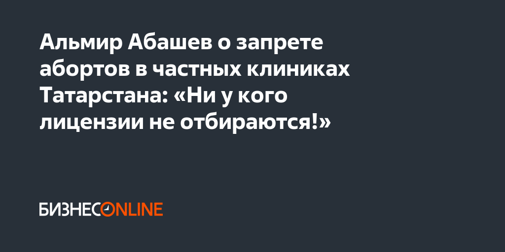 «Мы (минздрав РТ — прим. ред.) совместно с Росздравнадзором и прокуратурой налаживаем порядок. Есть документ, в котором прописано, как это (проведение абортов — прим. ред.) должно быть. Ни у кого лицензии не отбираются, все делается, любой может продолжить эту работу — делайте все правильно», — прокомментировал Абашев в рамках «Диалогов с властью» 5 декабря.