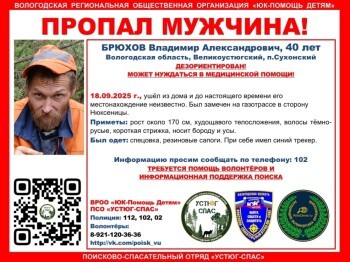 40-летний Владимир Александрович Брюхов, житель поселка Сухонский Великоустюгского округа, ушел накануне из дома и не вернулся.