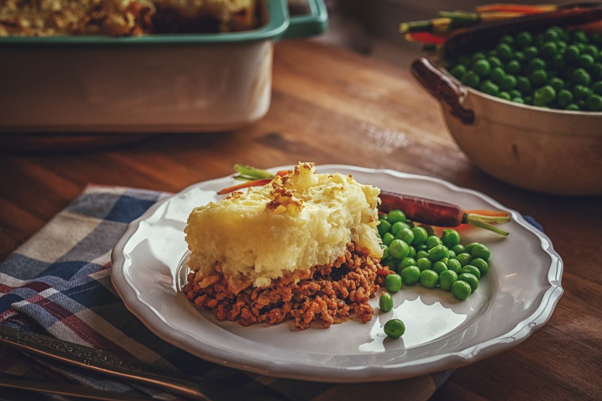 5. Выложите мясной соус в форму для запекания с высокими бортами и сверху покройте его картофельным пюре. Придайте узор ложкой или вилкой. Отправьте запекаться в предварительно разогретую духовку при 180°C на 20–25 минут до образования корочки на поверхности.
