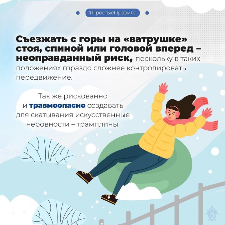 В ведомстве отметили, что в этом зимнем сезоне уже имели место случаи травмирования в результате катания на надувных санях. Поэтому важно соблюдать простые правила безопасности: кататься только в специально оборудованных для этого местах, либо на территориях без препятствий и не ведущих на дорогу; не привязывать санки и тюбинги к автомобилю.