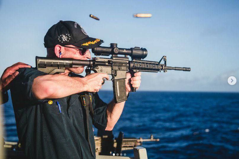 Командир ракетного эсминца USS John S. McCain ВМС США ведёт огонь из винтовки... с обратно установленным прицелом.