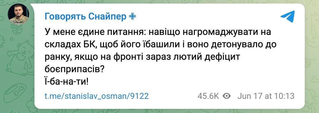 У меня единственный вопрос: зачем накапливать на складах БК, чтобы его взрывали и он детонировал до утра, если на фронте сейчас острый дефицит боеприпасов?