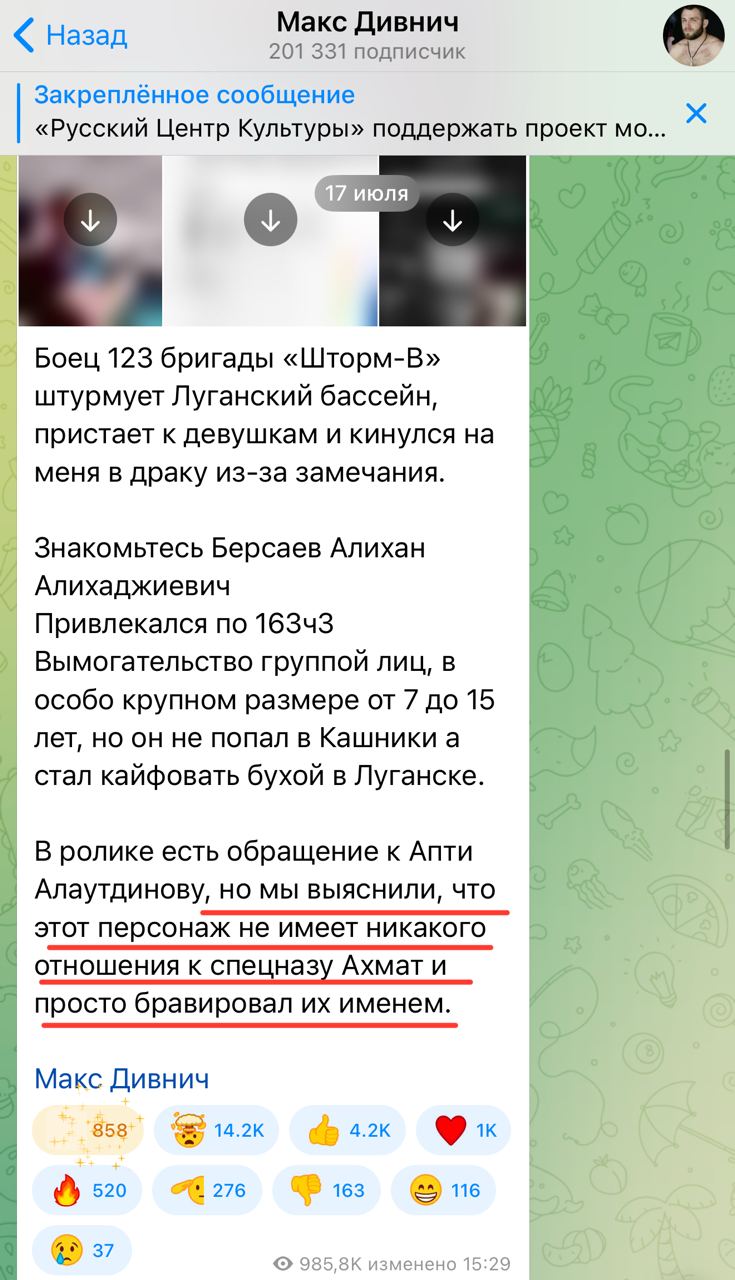 Далее, Максим выложил пост с видео доказательства и задал вопрос чеченскому генералу, что он думает о том, что боец якобы его подразделения так себя ведёт. В этот или уже на следующий день выяснилось, что крыса Алихан не является военнослужащим ахмата, после чего Дивнич выпустил несколько видео где это поясняет и отредактировал свой первоначальный пост (3, 4 видео и скрин).