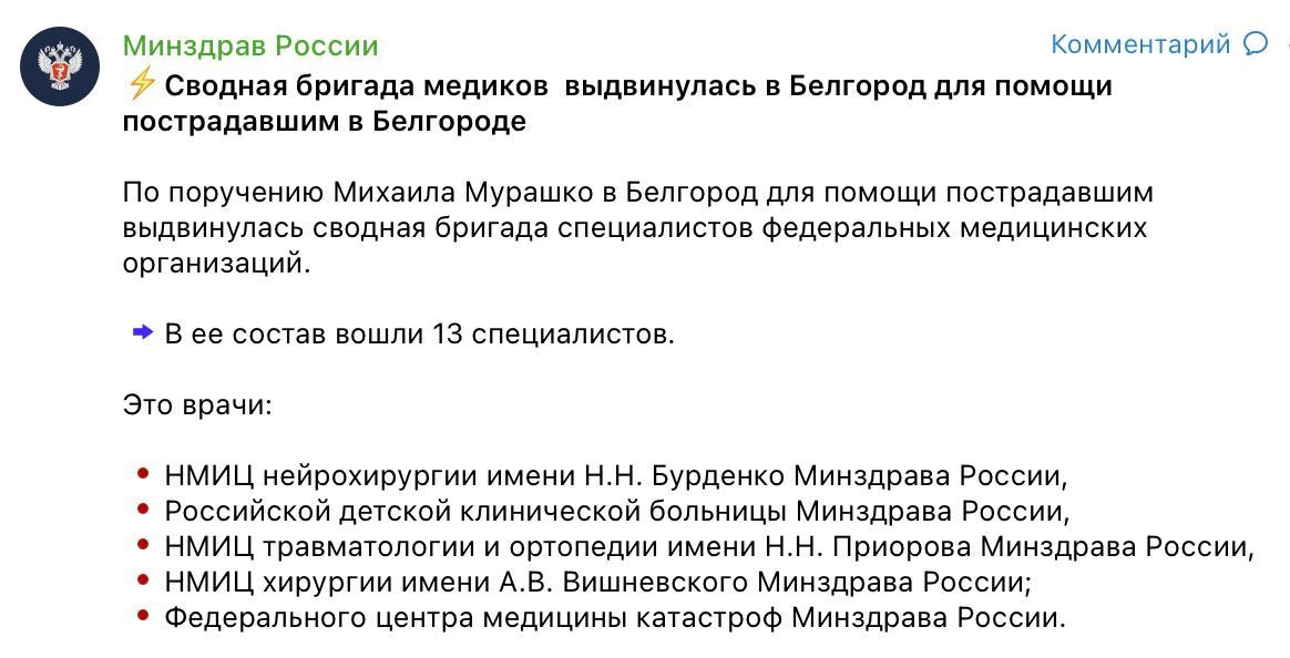 Бригада медиков федеральных организаций выдвинулась в Белгород