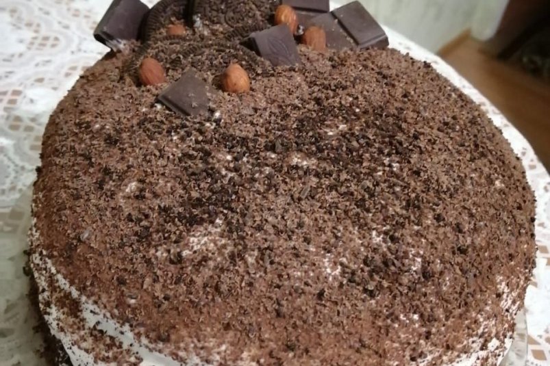 Коржи разрежьте пополам. Каждый слой обильно смажьте кремом, соберите торт. Украсьте крошкой от коржей или полейте глазурью из сахарной пудры с водой. Торту достаточно постоять в холодильнике 1-2 часа, чтобы пропитаться.