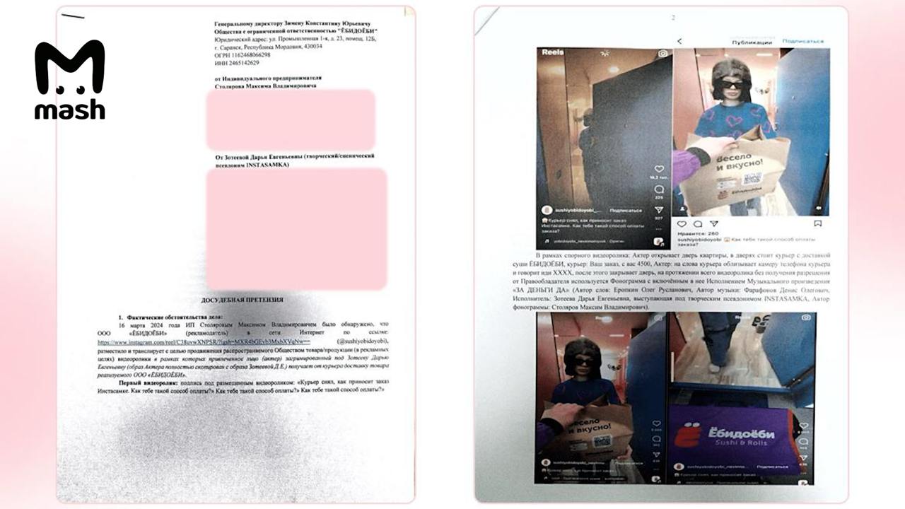Махаться начали в марте. Когда команда Даши Зотеевой (имя артистки) увидела рилс "Ёбидоёби" в запрещённой инсте. Там: целый клип с мотивом "За деньги да", уж очень похожая на Инстасамку актриса и прочее очевидное. Отправили досудебную претензию (на фото) с требованием всё удалить и заплатить три млн рублей за авторские права, 500к рублей за моральный вред и 150к за работу юриста.