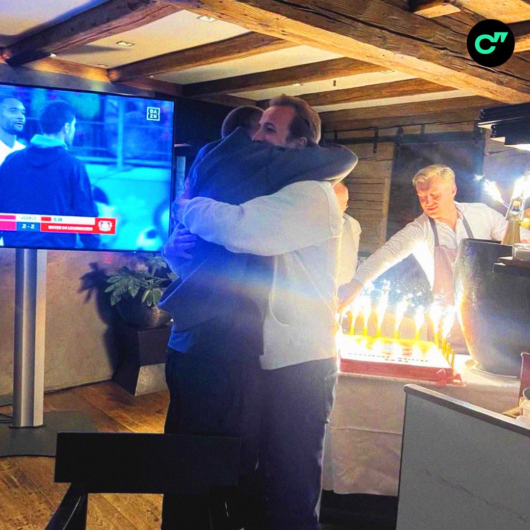 🥳🏆 Харри Кейн и Эрик Дайер уже празднуют первый трофей в карьере: футболисты «Баварии» следили за матчем «Байера» в окружении торта с фейерверками и огромного ведра с шампанским