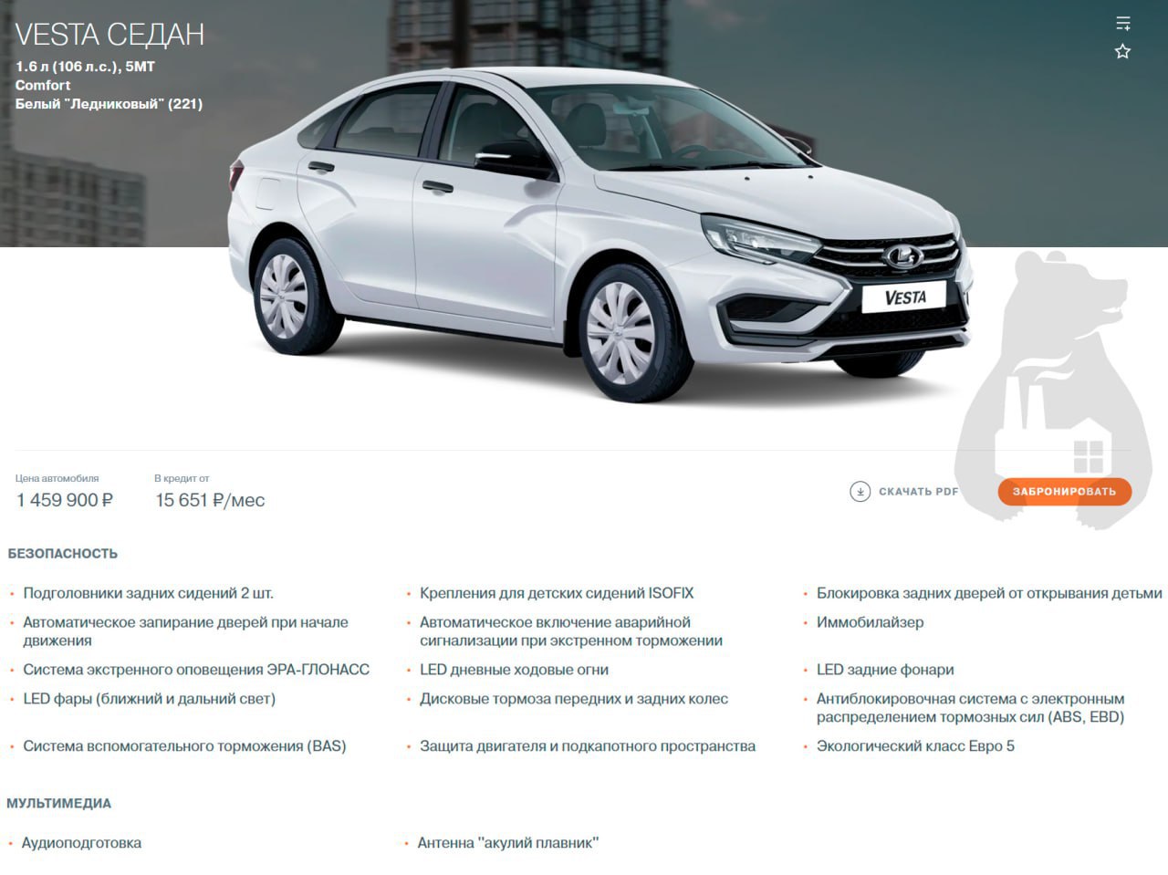К примеру, седан Lada Vesta в варианте Comfort рекомендован к продаже от ₽1,46 млн. При этом в машине даже нет подушки безопасности. Хотя в графе «Безопасность» мы обнаружим аж 15 пунктов, но одного из главных элементов все-таки не найдем.