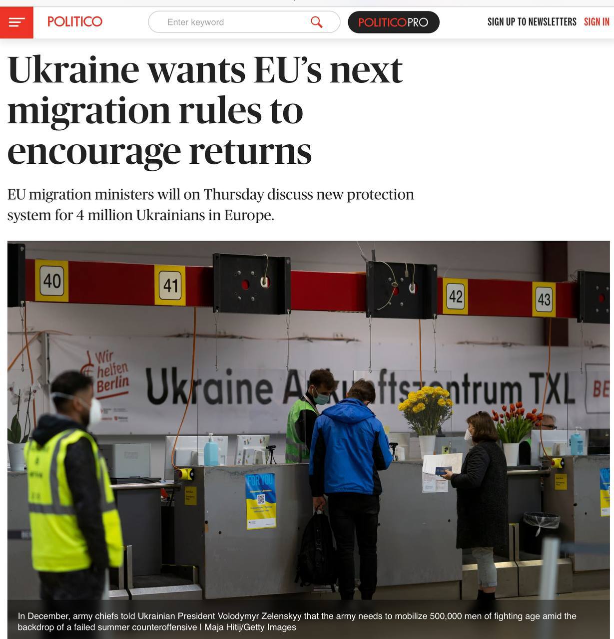 По данным Politico, в четверг миграционные министры стран ЕС будут обсуждать судьбу миллионов украинских беженцев на предмет «поощрения» их возвращаться домой. Делается это под фактическим нажимом Украины. Издание заявляет: