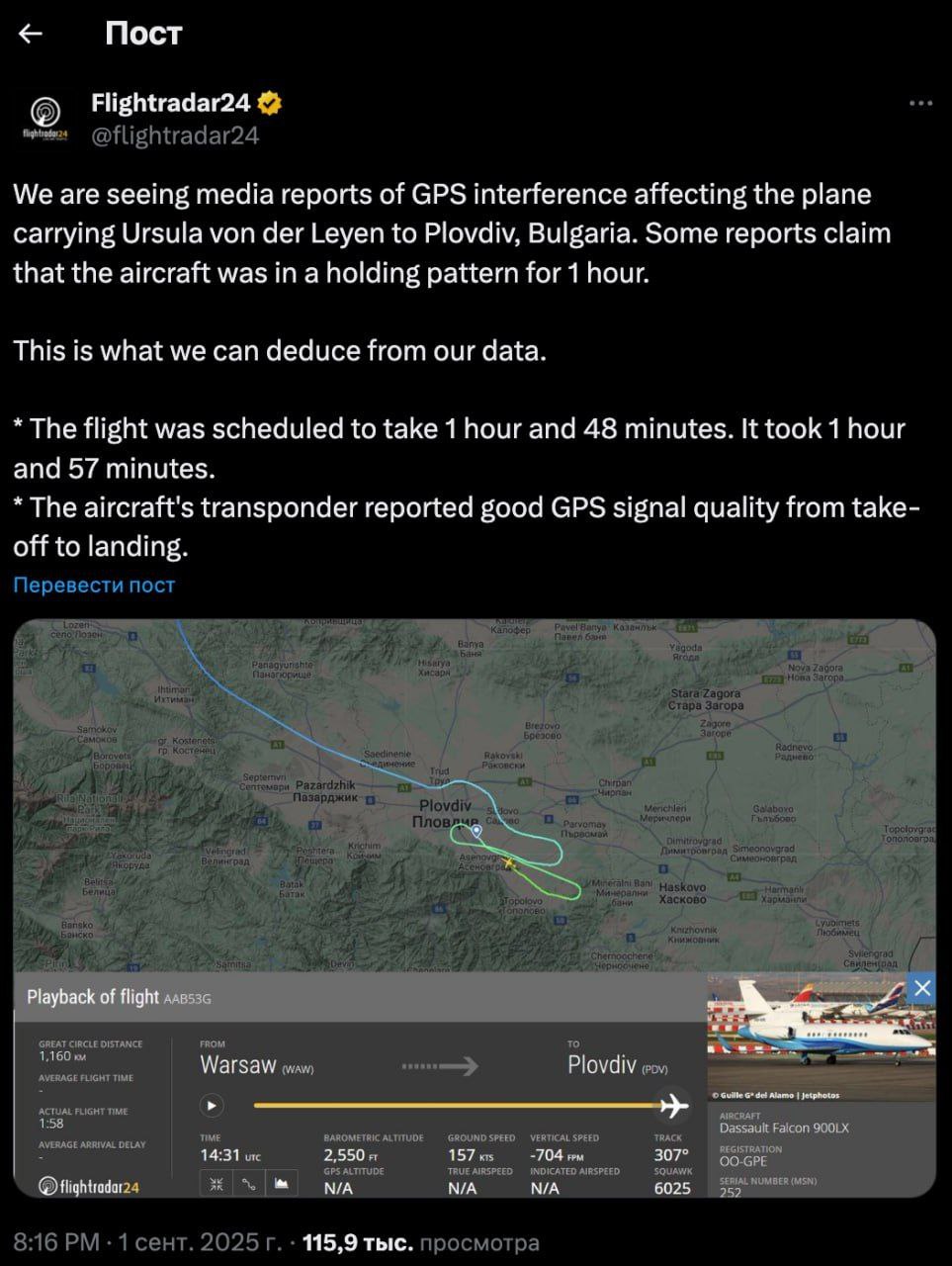 Аппарат главы Еврокомиссии Урсула фон Дер Ляйн сообщил, что ее самолёт едва не упал из-за того, что Россия пыталась радиопомехами сбить его у болгарского города Пловдив. Самолёт якобы кружил час и еле приземлился Но никаких помех в работе системы GPS у самолета с главой Еврокомиссии Урсулой фон дер Ляйен зафиксировано не было, заявил сервис отслеживания полетов Flightradar24. По данным Flightradar24, единственное, что произошло за рейс - самолет приземлился на 9 минут позже запланированного. Полет должен был занять 1 час 48 минут по расписанию, а продлился 1 час 57 минут. "Что мы можем сказать на основе наших данных: транспондер самолета сообщал о хорошем качестве сигнала GPS с момента взлета до посадки", - подчеркнули в сервисе. По всей видимости фон Дер Ляйн просто попыталась попугать европейцев и пошуметь во время чеса по военным заводам. @banksta