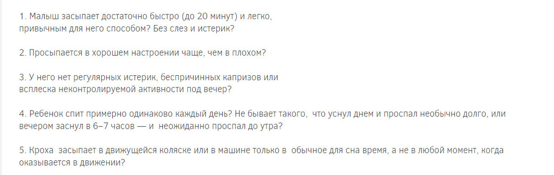 Есть простой родительский тест. Если вы ответите на все вопросы «да», то у вашего малыша все в порядке со сном. Если «нет» более двух паз, то стоит обсудить проблему со специалистом.