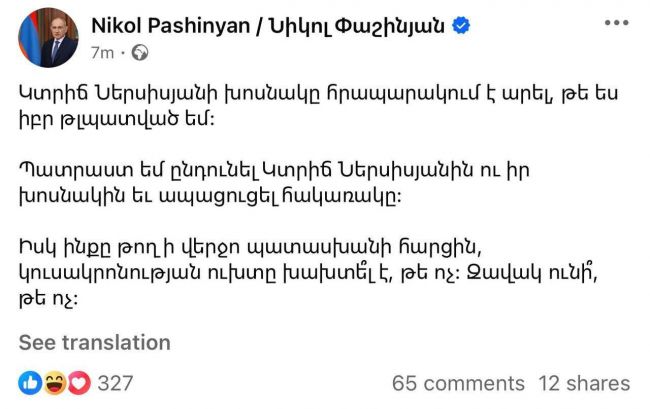 «Представитель Ктрича Нерсисяна (католикос всех армян Гарегин II. — EADaily) сделал заявление о том, что я якобы обрезан. Я готов принять Ктрича Нерсисяна и его представителя и доказать обратное. И пусть он наконец ответит на вопрос, нарушил ли он обет безбрачия или нет. Есть ли у него ребенок или нет?» — написал глава правительства Армении.