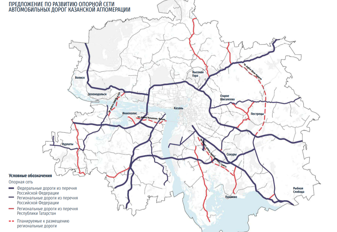 Преемственность решений генерального плана Казани, как центра агломерации, обеспечена продлением магистралей общегородского уровня за административные границы Казани к формируемым точкам роста»