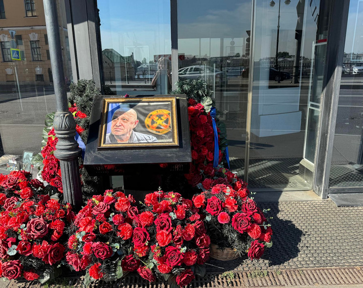Снаружи кафе кто-то оставил портрет погибшего военкора. Тут же лежат ритуальные венки и огромный портрет Евгения Пригожина.