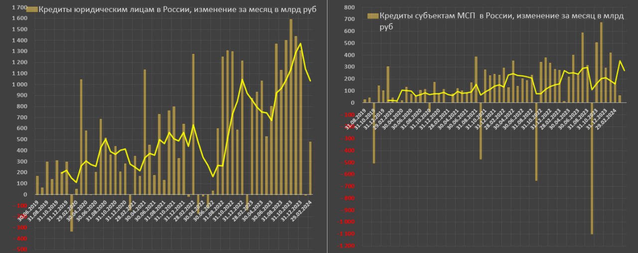 Чистый прирост кредитования юрлиц составило 479 млрд в феврале, а с начала года плюс 471 млрд, что ниже 737 млрд в 2023, 1258 млрд в 2022, но пока еще выше 2021 (209 млрд) за январь-февраль.