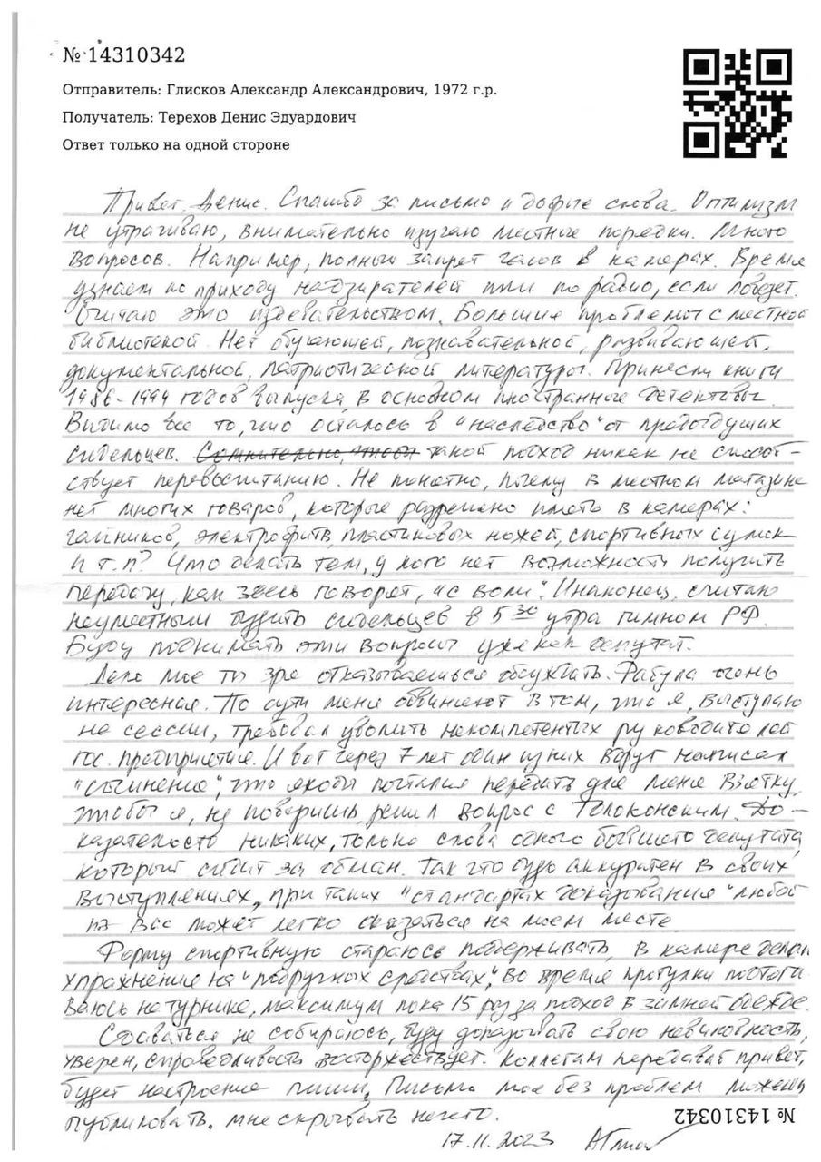 Арестованный депутат Заксобрания Красноярского края Александр Глисков написал письмо из СИЗО депутату Денису Терехову, а тот с разрешения самого Глискова опубликовал его в своем телеграм-канале. В письме народный избранник пожаловался на подъемы в 05:30 утра под гимн России, отсутствие товаров в тюремном магазине, запрет часов в камере, плохую библиотеку и другое.