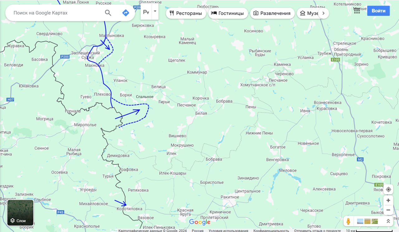 Но его атака со стороны территории Украины южнее Плёхово, вначале была успешной. Противник сумел дойти до н.п. Гирьи, где был встречен нашими резервами и отражен с большими для себя потерями. Но, отошел он не на исходные позиции, а лишь чуть оттянулся назад, где сейчас и производит перегруппировку. Завтра, вероятно все повторится вновь.