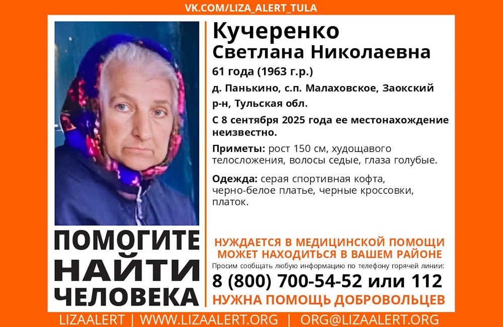 Кучеренко Светлана Николаевна была одета в спортивную кофту, черно-белое платье, черные кроссовки и платок. По информации волонтеров, пожилая тулячка вышла из дома вчера, 8 сентября, и не вернулась.