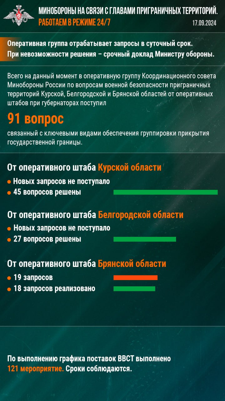 ❗️ Всего на данный момент в оперативную группу Координационного совета Минобороны России по вопросам военной безопасности приграничных территорий Курской, Белгородской и Брянской областей от оперативных штабов при губернаторах поступил 91 вопрос, связанный с ключевыми видами обеспечения группировки прикрытия государственной границы (в том числе, материально-техническое, транспортное, военно-техническое, медицинское, инженерно-строительное).