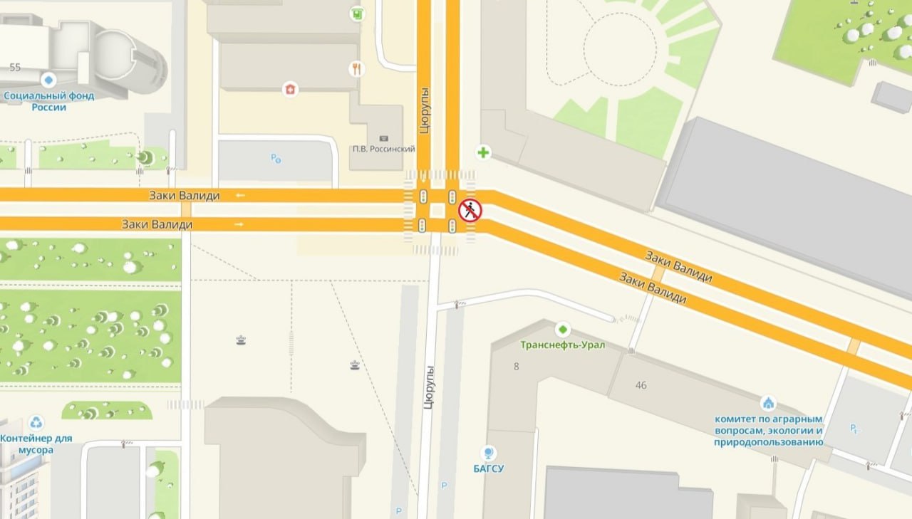На пересечении улиц Заки Валиди и Цюрупы принято решение ввести П-образное движение пешеходов. По данным городских служб, это позволит уменьшить количество конфликтных ситуаций между пешеходами и автомобилистами, а также повысит пропускную способность одного из самых оживленных участков в городе