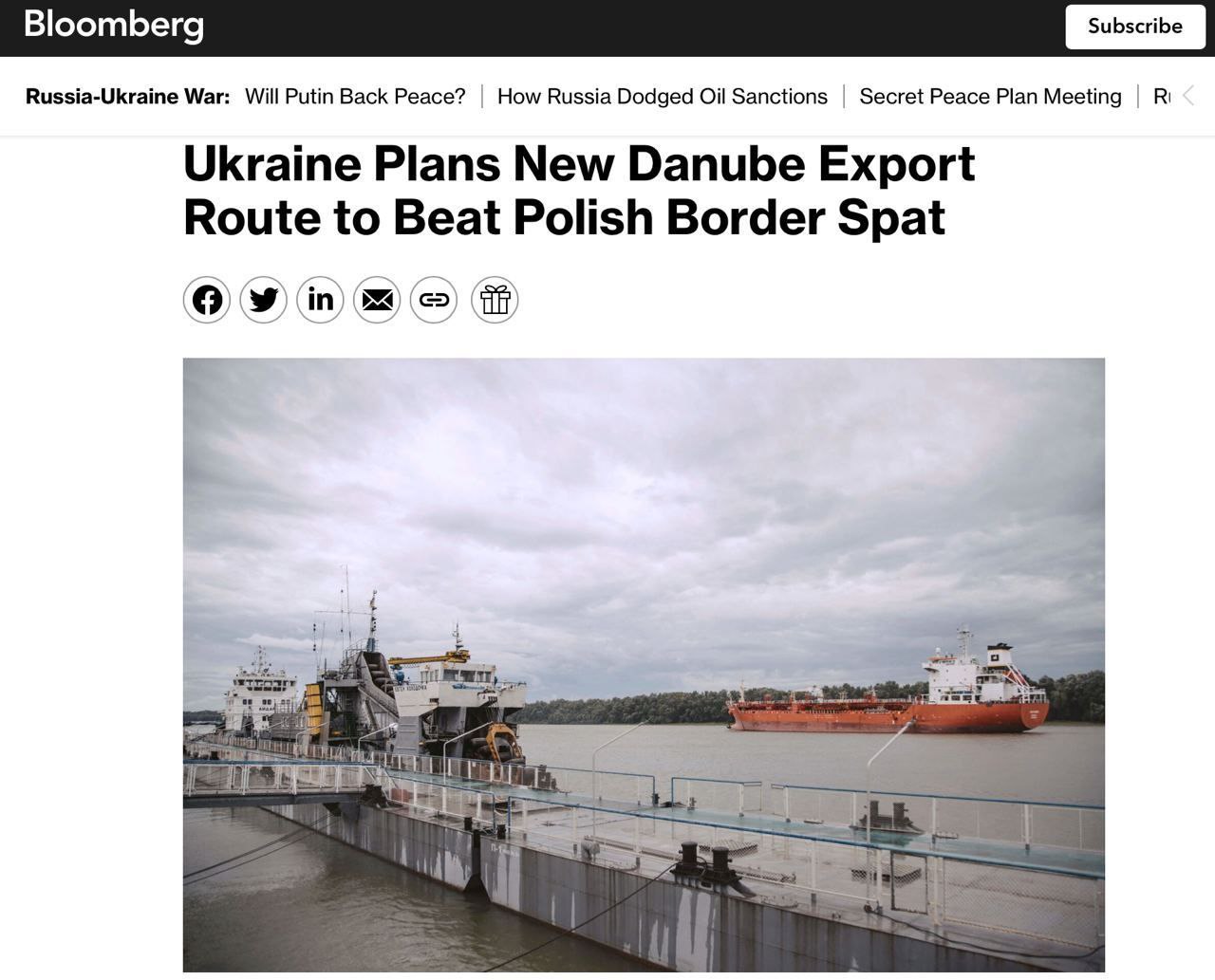 Украина планирует проложить новый экспортный маршрут по Дунаю для преодоления блокады польской границы, — Bloomberg со ссылкой на министра инфраструктуры Кубракова