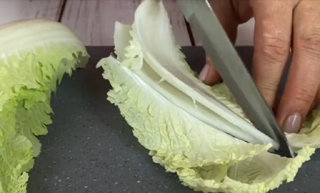 1. Первым делом мелко шинкуем пекинскую капусту. Она придаст салату легкость и свежесть.