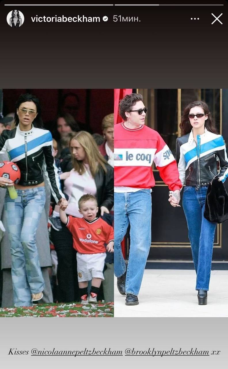 Виктория Бекхэм в сторис как бы намекает, что ее сын находится в надежных руках Николы Пельтц. И не только Бруклина, но и свою винтажную курточку пристроила.