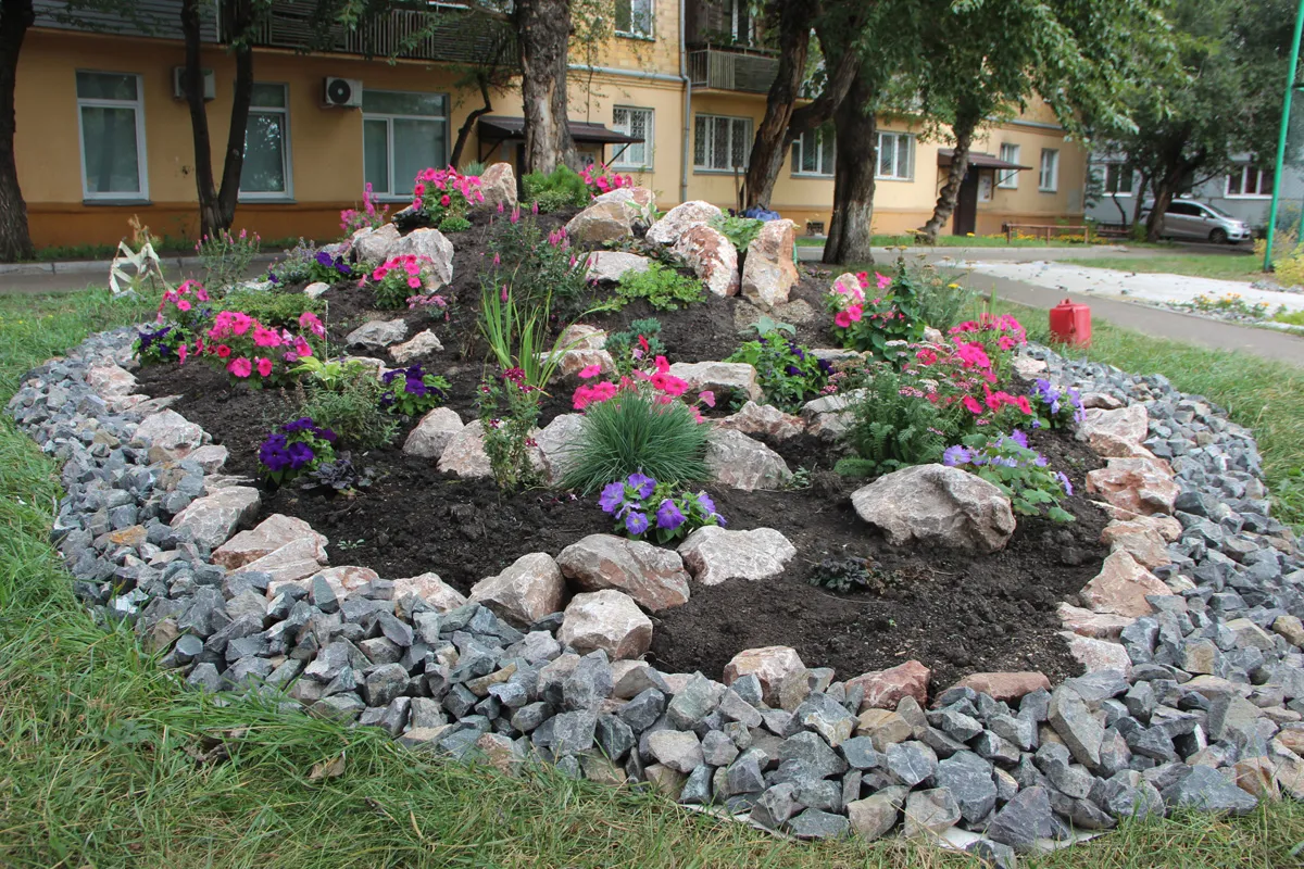 Во многих дворах обустроили рокарии – клумбы и цветники, украшенные камнями. Рокарии вышли самые разные – плоские, рельефные, в форме горок и другие. Также использовалась гранитная крошка, щепа. Самыми популярными украшениями стали гортензии и похожие на них сорта калины.