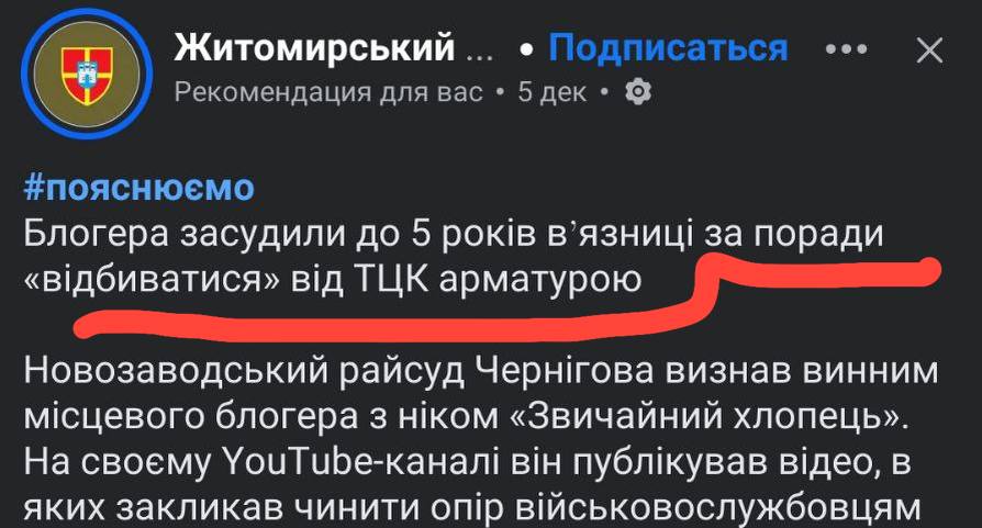 А вот парню 5 лет за слова в видео о том, что надо отбиваться от ТЦК.