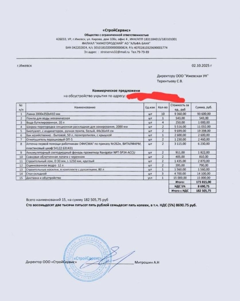 Судя по информации в смете, которая прилагается к письму, стоимость укрытия в подвале многоквартирного дома обойдется его жильцам почти в 183 тысячи рублей. Так, стоимость одной лавки (которых по смете десять) составляет 9360 рублей, 20 литров бутилированной воды — 250 рублей, биотуалет с индикатором — 9700 рублей, бак хозяйственный на 50 литров — 2600 рублей, аптечка первой помощи — 3115 рублей и т. д.