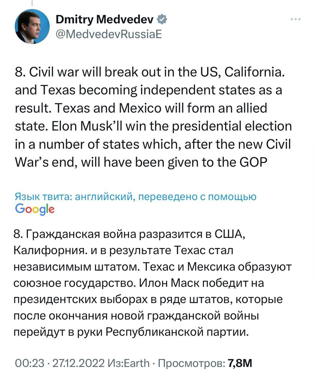 🔮Дмитрий Медведев, делая прогнозы на 2023 год, допускал гражданскую войну в США и отделение Техаса с последующей пересборкой республиканских Штатов под президента Илона Маска. Прогноз начал сбываться в 2024 году