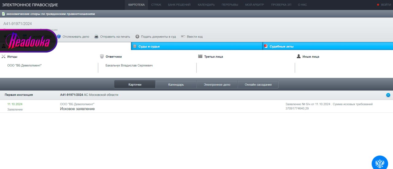 В картотеке Арбитражного суда Московской области появилась карточка дела, где «ВБ девелопмент» — истец, с суммой требований в ₽37 млрд к Владиславу Бакальчуку. Эта компания занималась строительством складов для Wildberries и на 100% принадлежит бывшему мужу основательницы маркетплейса. Сам Бакальчук говорил, что «ВБ девелопмент» — бизнес-единица головной компании.