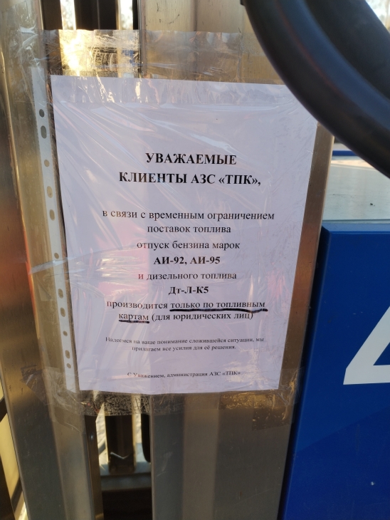Оператор АЗС добавила, что когда топливо появится, неизвестно. Ещё в начале недели автовладельцы заезжали на заправку, а позже появилась информация, что топливо отпускают только по топливным картам. Сегодня отпуск бензина производится.