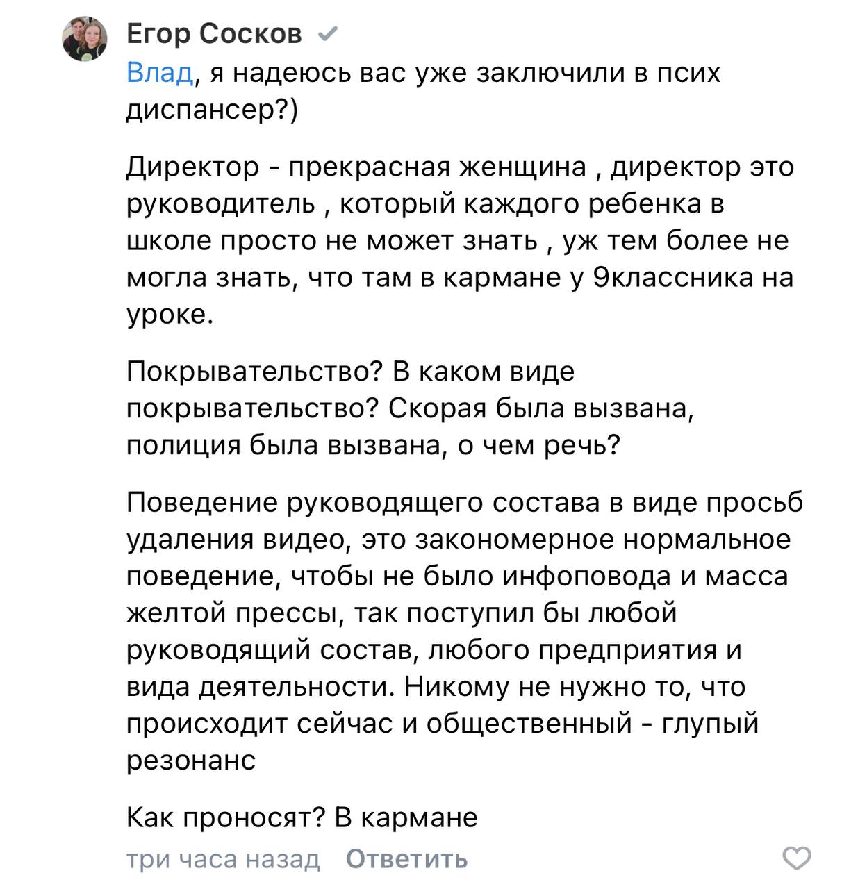 И да, объясните Егорке со скрина, что без «общественного – глупого резонанса» не было бы никаких уголовных дел, всё это хотели спустить на тормозах. Теперь там проверки и ответственных лиц нужно привлекать к ответственности, потому что в школе абу-бандиты бегают с ножами и это не единственный случай, в том числе и с этим малолетним ублюдком. То, что там появилась уже положительная характеристика — очевидная попытка решалова.