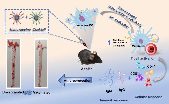 созданная учёными "нановакцина" значительно тормозит прогрессирование атеросклероза, активируя как гуморальные, так и клеточные иммунные реакции, показано в отчётном исследовании опубликованном в журнале Nature.