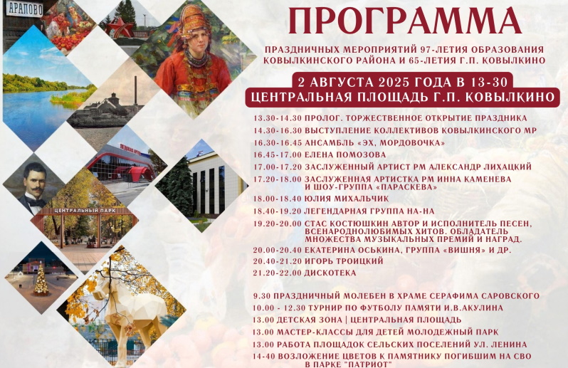Группа «На-На», Стас Костюшкин и Юлия Михальчик приедут в Мордовию, чтобы поздравить жителей Ковылкинского района с праздником. 2 августа тут отметят 97-летие района и 65-летие города Ковылкино.