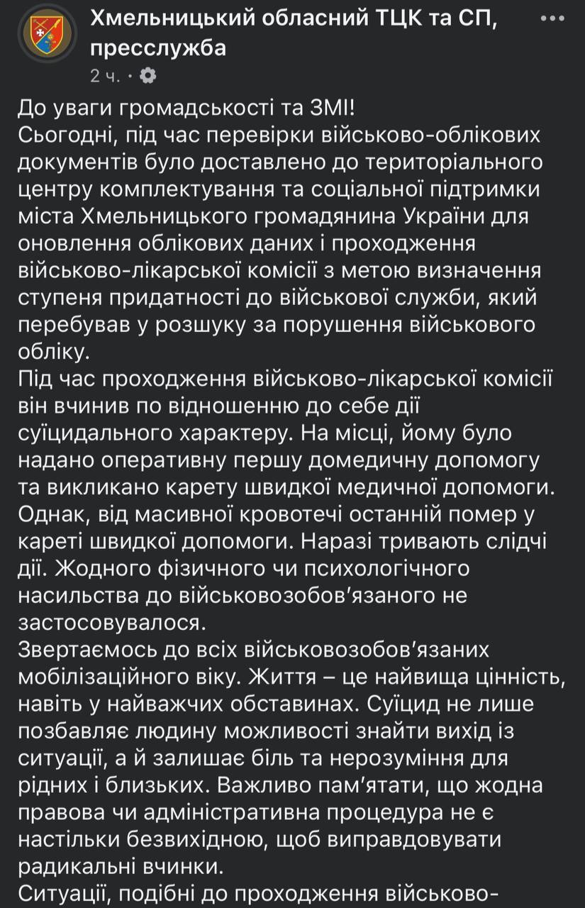π Π Π₯ΠΌΠ΅Π»ΡΠ½ΠΈΡΠΊΠΎΠΌ Π’Π¦Π ΠΌΠΎΠ±ΠΈΠ»ΠΈΠ·ΠΎΠ²Π°Π½Π½ΡΠΉ ΠΌΡΠΆΡΠΈΠ½Π° ΡΠΎΠ²Π΅ΡΡΠΈΠ» ΡΠ°ΠΌΠΎΡΠ±ΠΈΠΉΡΡΠ²ΠΎ, β Π·Π°ΡΠ²Π»Π΅Π½ΠΈΠ΅ Π²ΠΎΠ΅Π½ΠΊΠΎΠΌΠ°ΡΠ°
