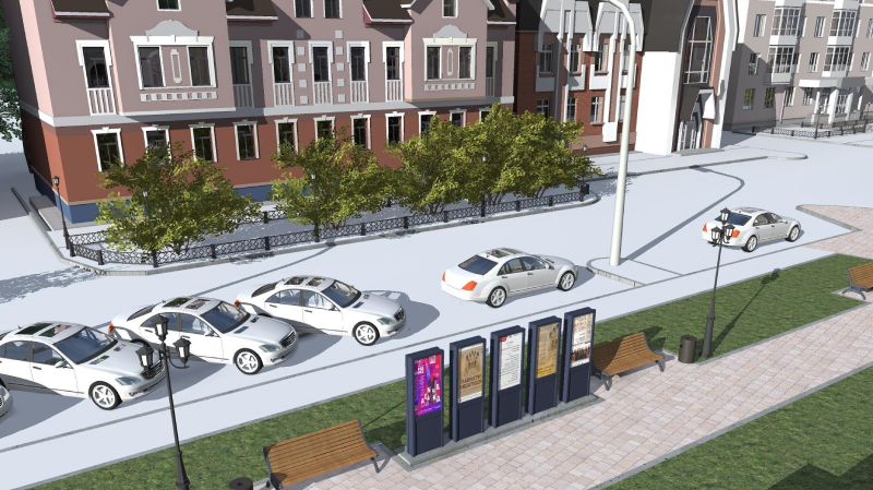 На обновленной территории помимо новых инженерных сетей, тротуаров, газонов, дорожек, фонарей, клумб и скамеек появятся совершенно уникальные объекты: памятники двум персонажам из прошлого (гимназистки и советского школьника), объемная карта Немецкой слободы на постаменте, «историческая» афишная тумба и информационно-рекламные LED экраны.