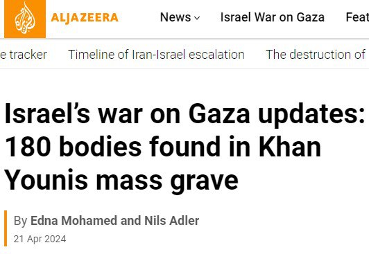 Массовое захоронение обнаружено на территории больницы в Хан-Юнисе Палестинские бригады гражданской обороны нашли 180 тел на территории медицинского комплекса «Насер», сообщает телеканал Al Jazeera. «Среди погибших есть женщины и дети», – говорится в материале. По данным издания, захоронение было сделано израильскими военными. Подписывайтесь на «Абзац»