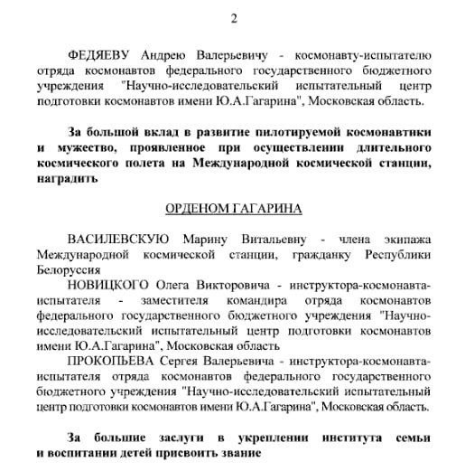 Президент РФ в День космонавтики присвоил звания Героев России космонавтам Петелину и Федяеву, а белорусскую космонавтку Василевскую наградил орденом Гагарина.