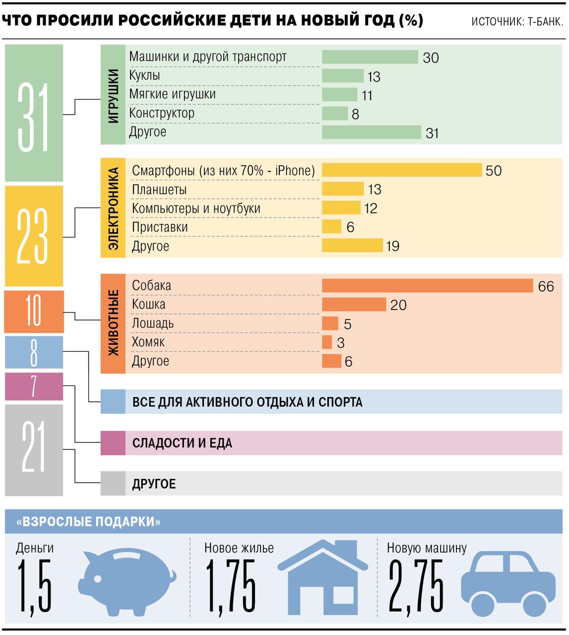 Чаще всего дети загадывали на Новый год игрушки (31%), на втором месте - гаджеты (23%), а третьей по популярности категорией стали домашние животные (10%).