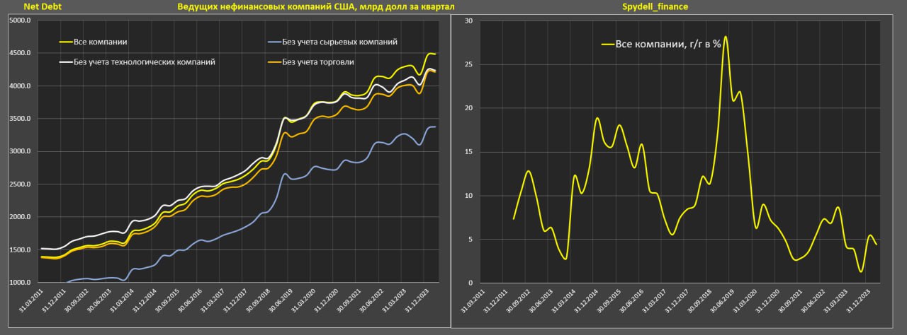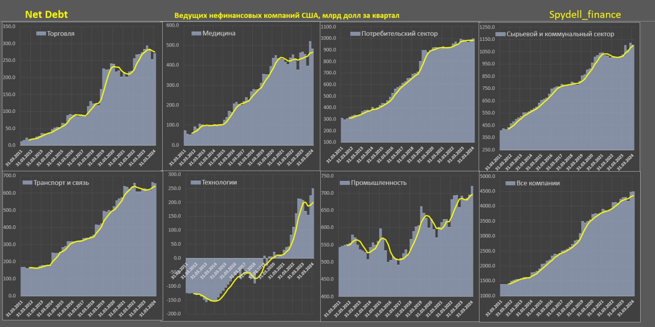 Быстрые темпы роста чистого долга в технологическом секторе целиком и полностью обусловлены невменяемой акционерной политикой ведущих ИТ компаний, которые утилизируют сотни миллиардов долларов в обратный выкуп и на дивиденды (выше своих возможностей, несмотря на высокие прибыли), чтобы покрывать непомерные аппетиты спекулянтов, разогнавших акции в стратосферу. Чистое безумие, особенно в эпоху высоких ставок.