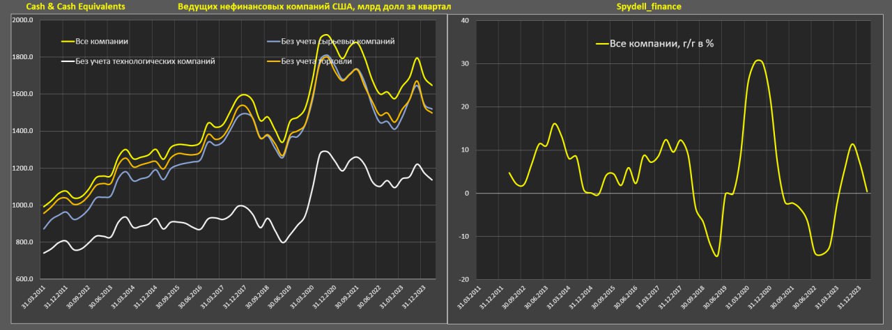 Объем кэш позиции на 1кв24 составляет 1.65 трлн для представленных компаний с тенденцией на снижение последние 3 года (максимум был в 3кв20 на уровне 1.92 трлн).
