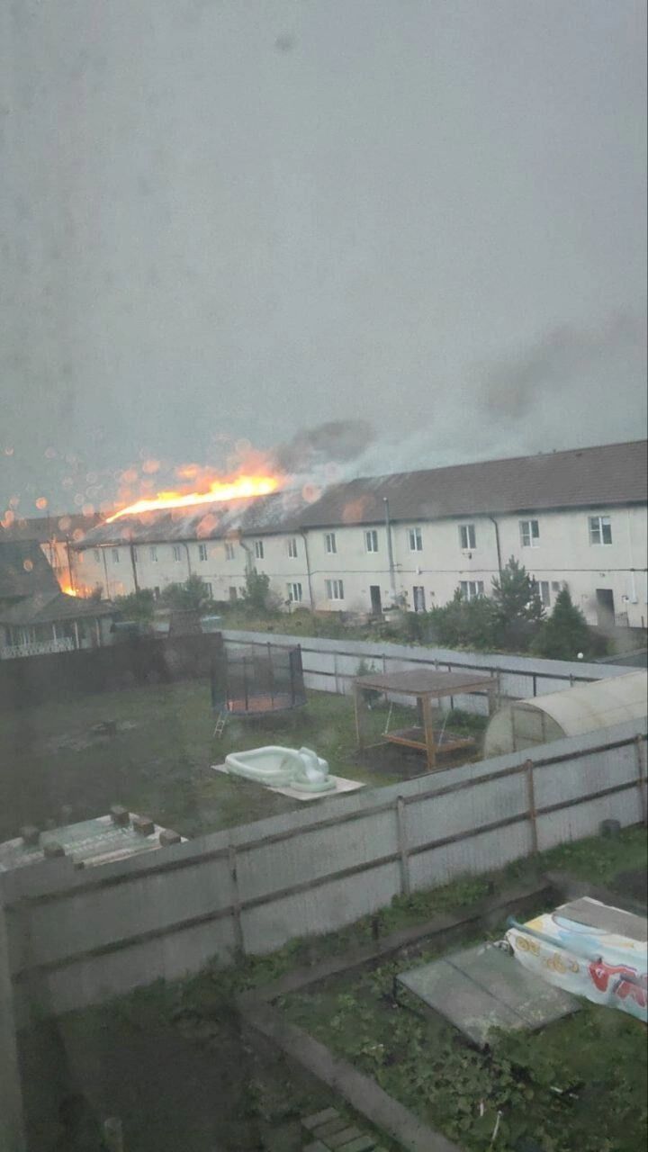 Местные жители в соцсетях утверждают, что таунхаус загорелся после удара молнии. «Проспекту Мира» в МЧС подтвердили факт пожара.