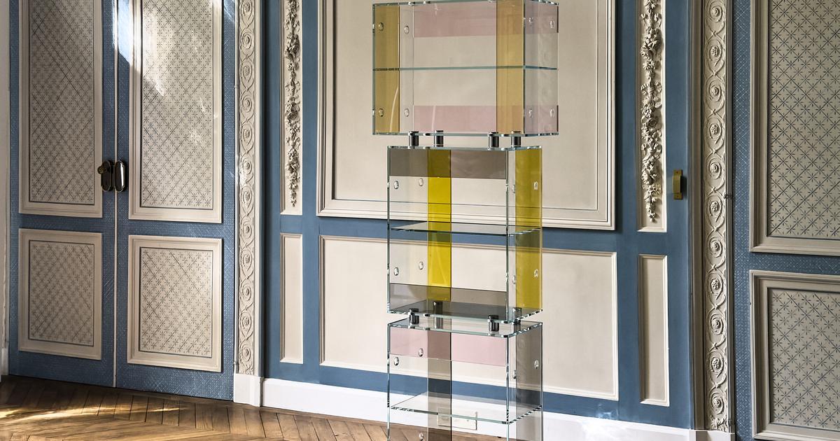 Parmi les heureux élus : Marco Campardo, Jolie Ngo, Duyi Han et les Français Marie et Alexandre. L’une des œuvres mises en avant est un montage de leurs boîtes modulables, réalisées en partenariat avec le verrier italien Glas Italia, initialement créées lors d’une exposition dans l’Appartement 50 de la Cité Radieuse, conçu par Le Corbusier à Marseille. Hommage à l’architecture modulaire de l’urbaniste français, ces boîtes, présentées pour l’occasion sous forme de totem de rangement, peuvent aussi se transformer en bureau grâce à des écrous en laiton dévissables soi-même. « C’était important pour nous de ne rien cacher et de favoriser ce système », explique le duo, qui se partage entre Paris et le sud-ouest de la France. « On essaye de trouver une intelligence dans les objets plutôt que d’être dans la surproduction. »