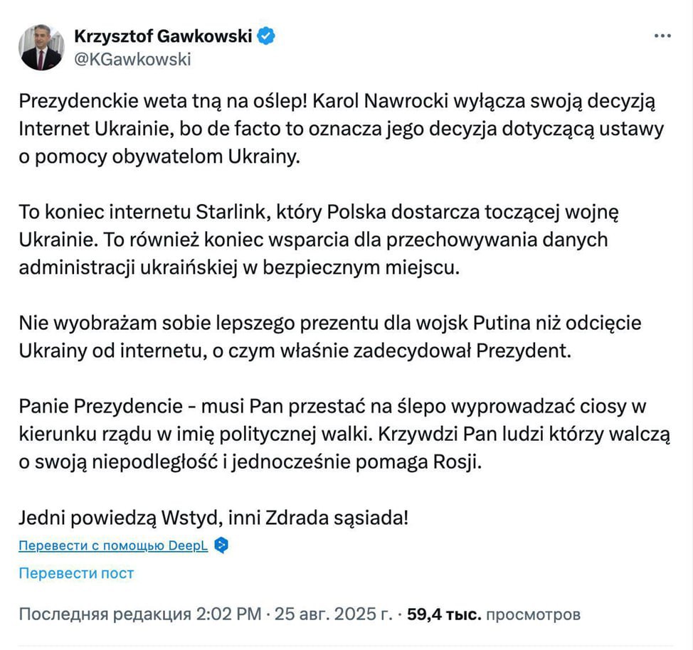 «Кароль Навроцкий своим решением отключает Интернет в Украине, потому что де-факто это означает его решение относительно закона о помощи гражданам Украины. Это конец Интернета Starlink, который Польша предоставляет воюющей Украине. Я не могу представить лучшего подарка для войск Путина, чем отключение Украины от Интернета», — написал Гавковский.