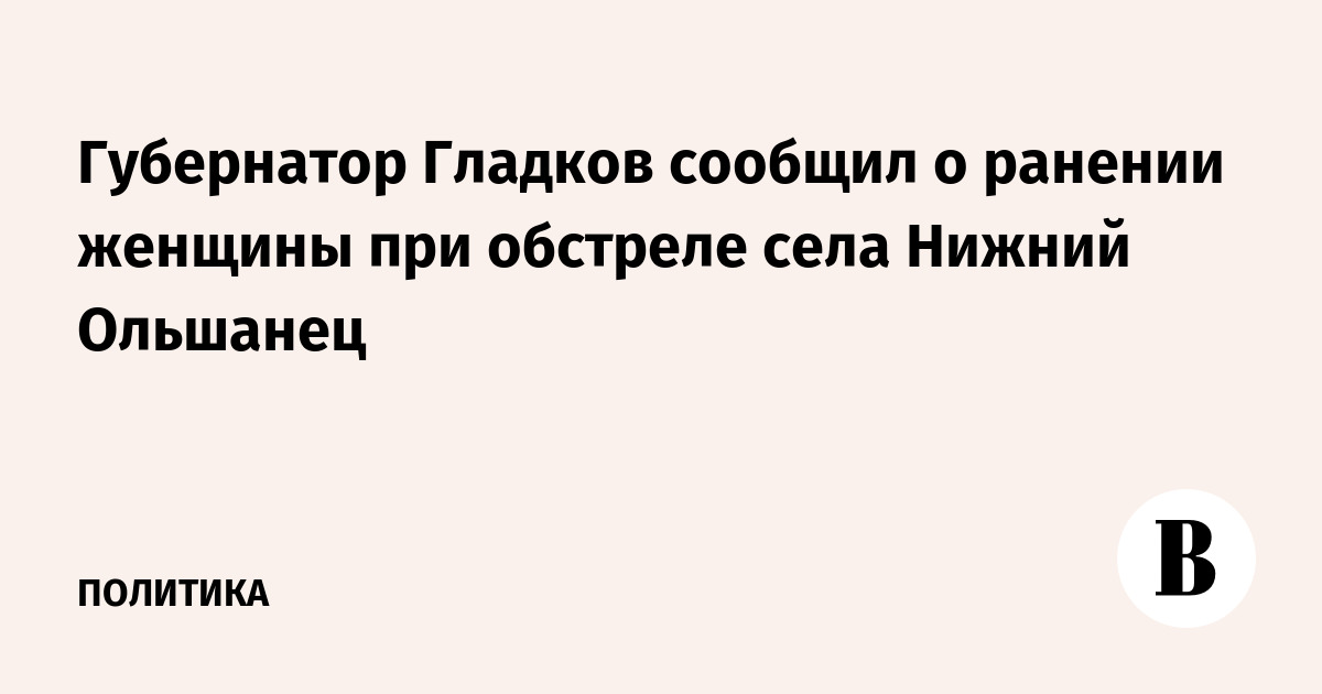 «В результате обстрела села Нижний Ольшанец есть одна пострадавшая с осколочными ранениями нижних конечностей. Бригады скорой медицинской помощи выехали на место», — написал Гладков.