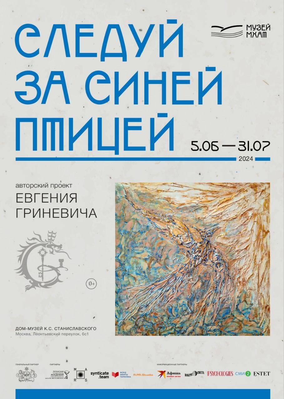 Авторский проект художника-концептуалиста Евгения Гриневича раскрывает смыслы пьесы Мориса Метерлинка «Синяя птица» – одной из самых популярных и мотивирующих детских сказок. Присутствие синих птиц даёт людям силы и веру в добро и счастье. Мы никогда не знаем точное время их прилёта, но узнаем их сразу по описанию великого Станиславского, который сказал: «Синяя птица должна быть наивна, проста, легка, жизнерадостна, весела и призрачна, как детский сон и, вместе с тем, величава…».